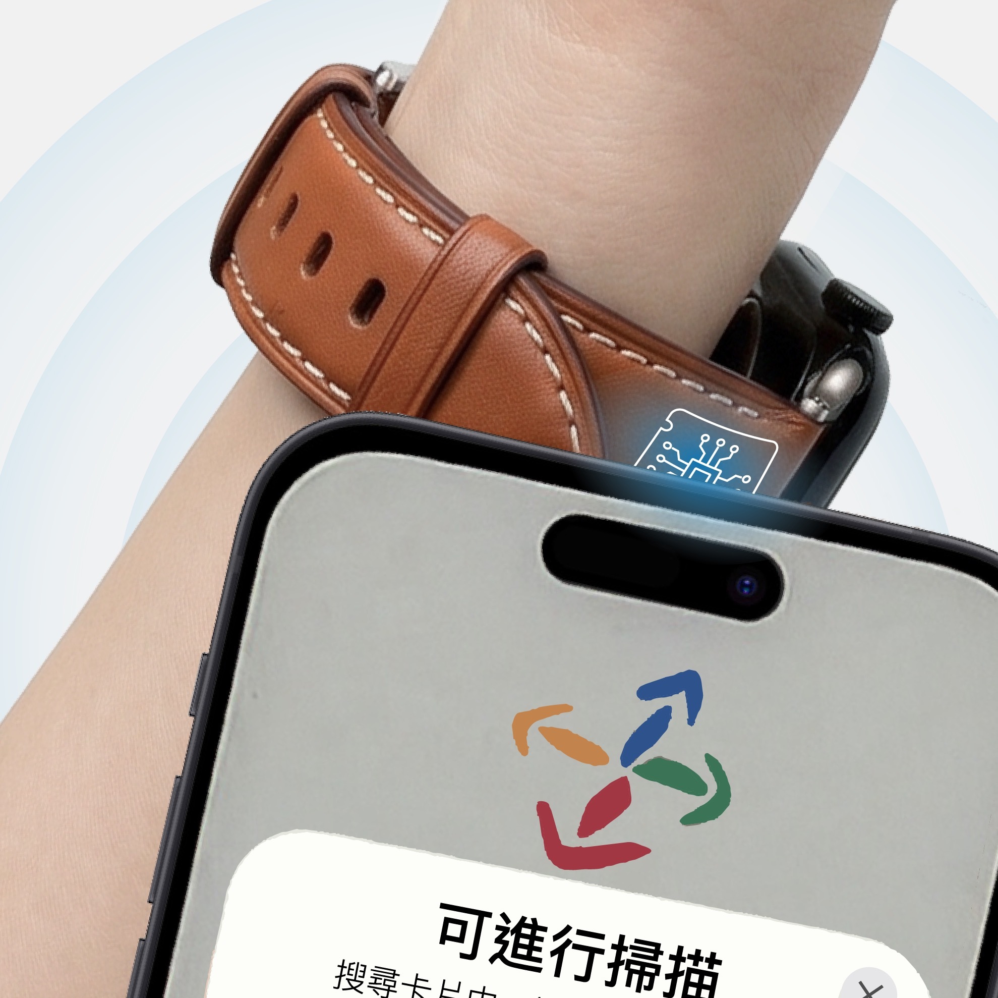 2. 晶片感應位置處於短帶靠近 apple watch 錶頭處。使用將感應位置輕靠機台,即可感應。